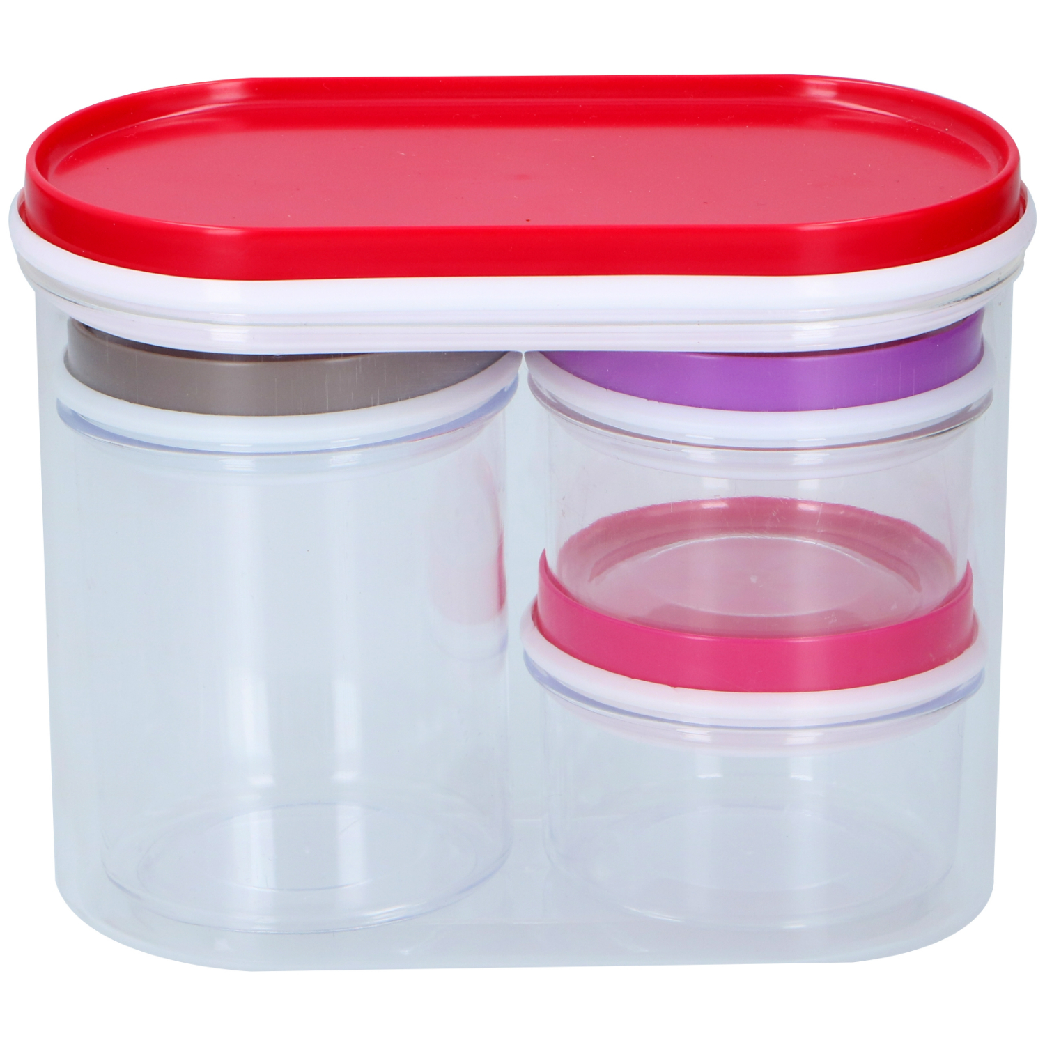 Organiseer je keuken- of badkamerkastjes met deze opbergdozen van Alpina. De set bestaat uit 4 transparante dozen in verschillende maten en hebben elk een andere kleur deksel. De twee kleinste doosjes hebben een inhoud van 90 ml, de middelgrote 230 ml en de grootste 970 ml.