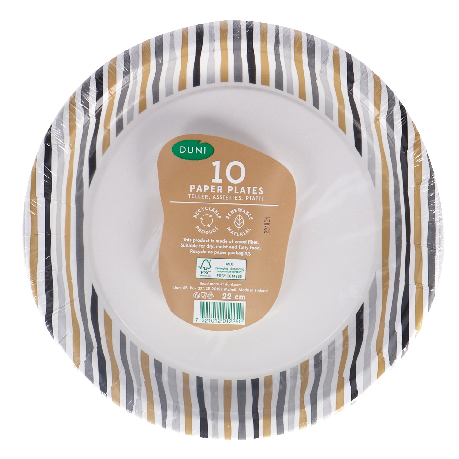 Jij bent klaar voor de picknick, de verjaardag of het kinderfeestje met deze Black & Gold Stripes borden van Duni! Deze papieren wegwerpborden zorgen ervoor dat jij je geen zorgen hoeft te maken over het afwassen van de vuile vaat! De verpakking bevat 10 borden met een diameter van 22 cm.