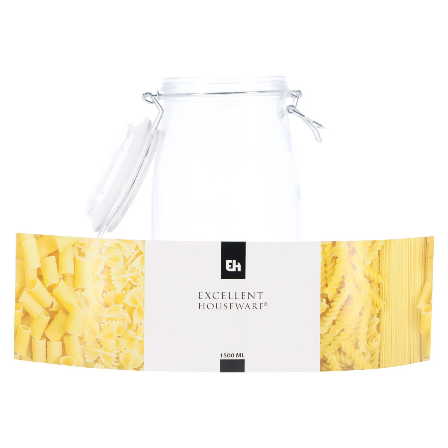 Excellent Houseware helpt jou met handige oplossing in de keuken! Zo hebben ze deze handige voorraadpot met deksel, waarin jij koekjes, kruiden, pasta, en allerlei andere etenswaren kunt opbergen! Dankzij het deksel met klembeugel en afsluitring blijft het eten dat jij in deze pot bewaard ontzettend lang goed! En met een inhoud van 1,5 liter kom jij nooit ruimte tekort!